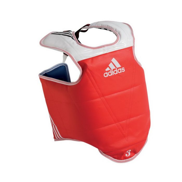 This chest guard features a shock absorbent high density foam interior covered in vinyl. The white shell is reversible, showing your choice of either blue or red target zones. Shoulder straps cross in back and tie together. The Adidas Hogu is approved by the World Taekwondo for competition sparring. Made In China.