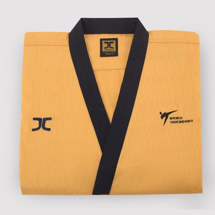 The Master Pro-Athlete Poomsae uniform is for the MASTER Division. The gold coloured jacket is a mix of 65% polyester and 35% cotton. The black trousers are 100% polyester. The uniform is light, breathable and durable. Belt not included.