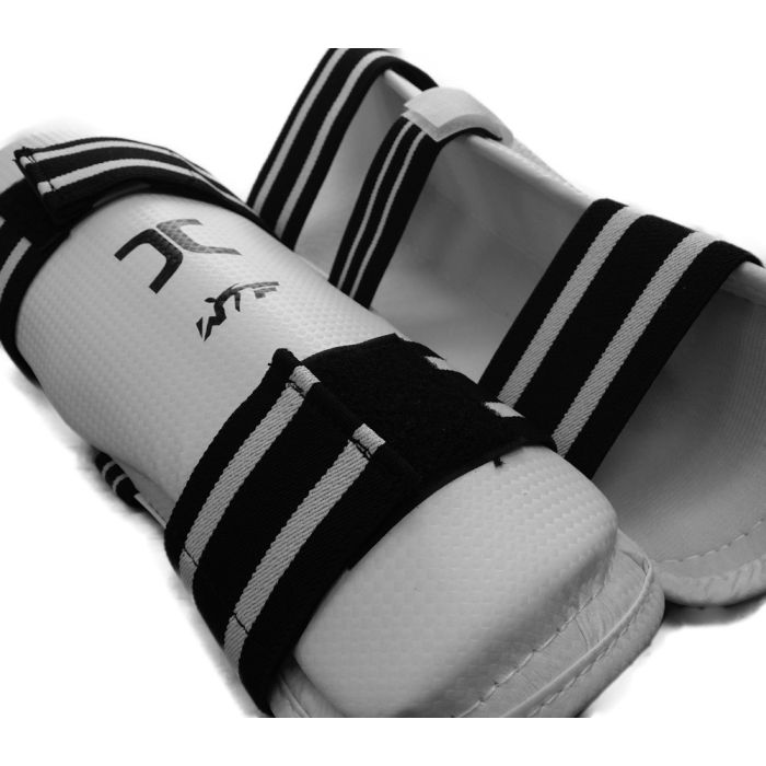 WTF approved taekwondo shin protectors for beginners. Two elastic straps with Velcro attachments. Nylon outer, PU Foam inner.