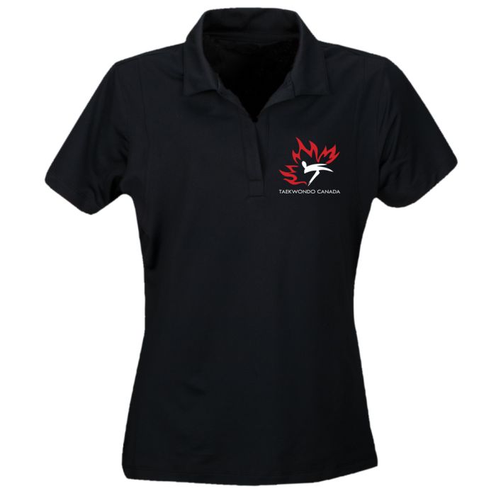 Black COAL HARBOUR® Snag Resistant Sport Shirt with Taekwondo Canada logo embroidered at front crest and printed "CANADA" on the back. Lightweight, tagless, 100% polyester flat tricotmicropique knit.