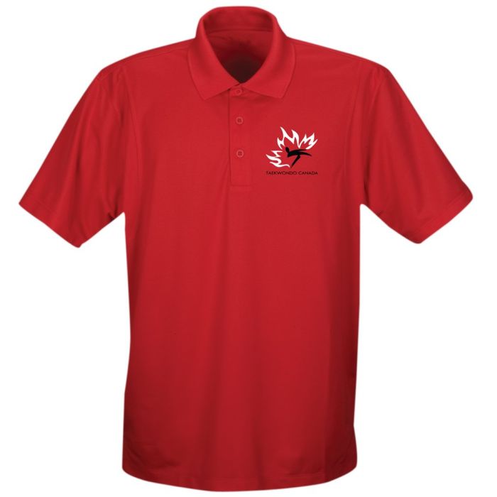 Red COAL HARBOUR® Snag Resistant Sport Shirt with Taekwondo Canada logo embroidered at front crest and printed "CANADA" on the back. Lightweight, tagless, 100% polyester flat tricotmicropique knit.